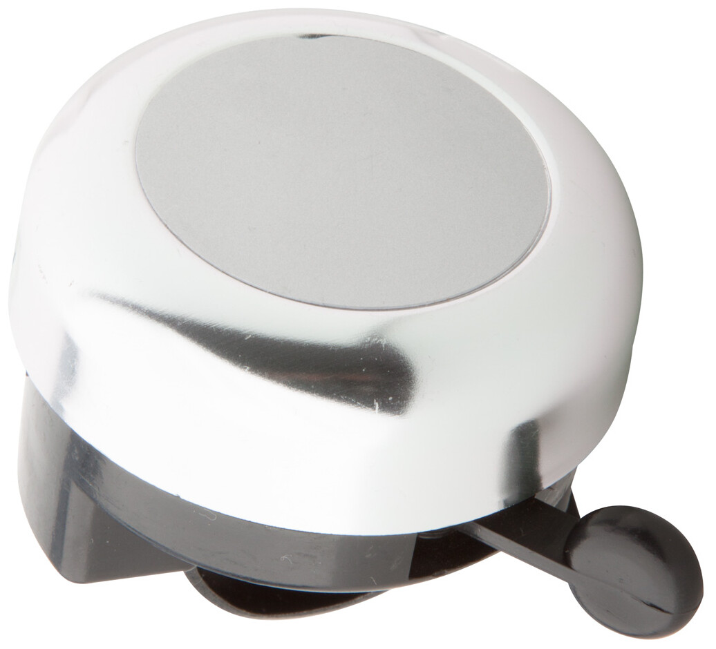 Hliníkový zvonek na kolo se stříbrnou plochou.