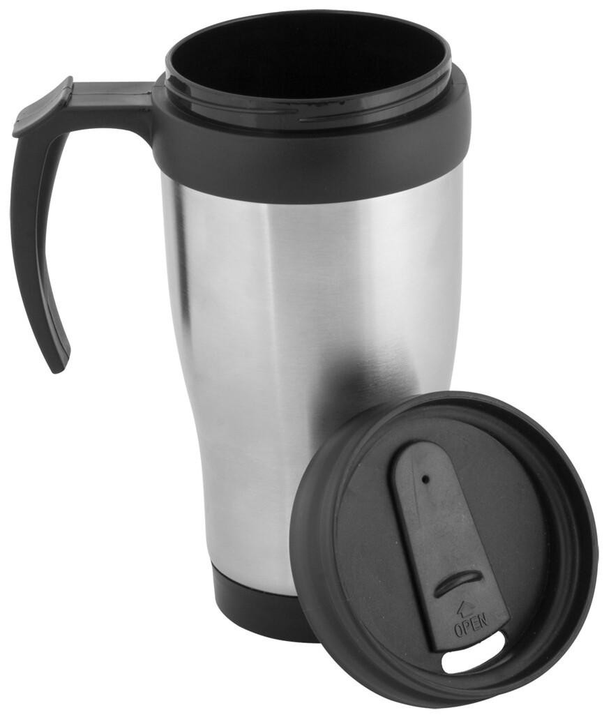 Kovový termohrnek s plastovým uchem a zavíratelným otvorem na pití ve víčku. Baleno v bílé krabičce, 450 ml.