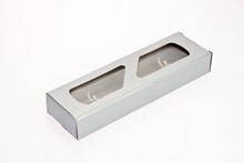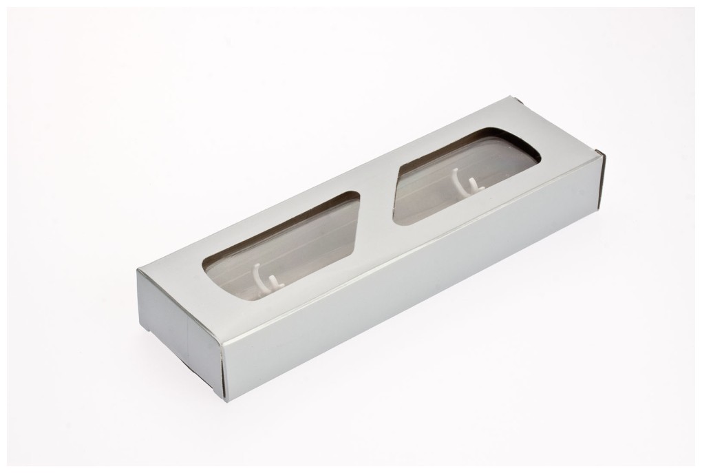 Čiré transparentní pouzdro na dvě tužky. Vrchní obal stříbrný lesklý papír s výsekem.