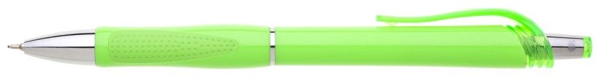 Neonová zelená plastová propiska s transparentním klipem a stříbrnými doplňky. Náplň X20 s mikrohrotem 0,5 mm, semi gel,modře píšící.