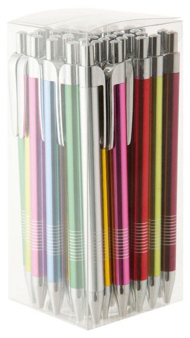 Kuličkové pero LAURIA je vyrobeno z hliníku. Má barevné tělo se stříbrnými doplňky jako jsou špička, klip a cvakátko. Úchopová část má 10 stříbrných proužků po celém obvodu tužky. Náplň- X20, modře píšící. Barevný MIX 25 ks v plastové krabičce.