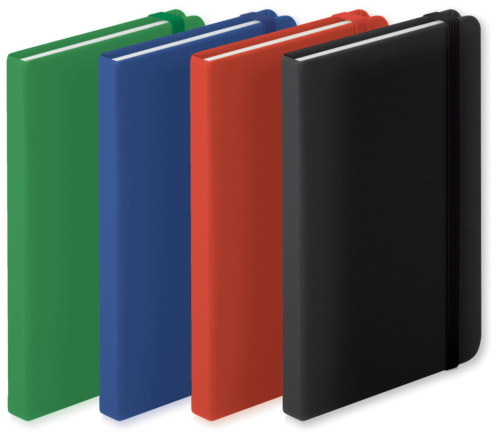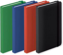 Blok s deskami z PU kůže, se 100 linkovanými listy, záložkou a gumičkou. Velikost A6.