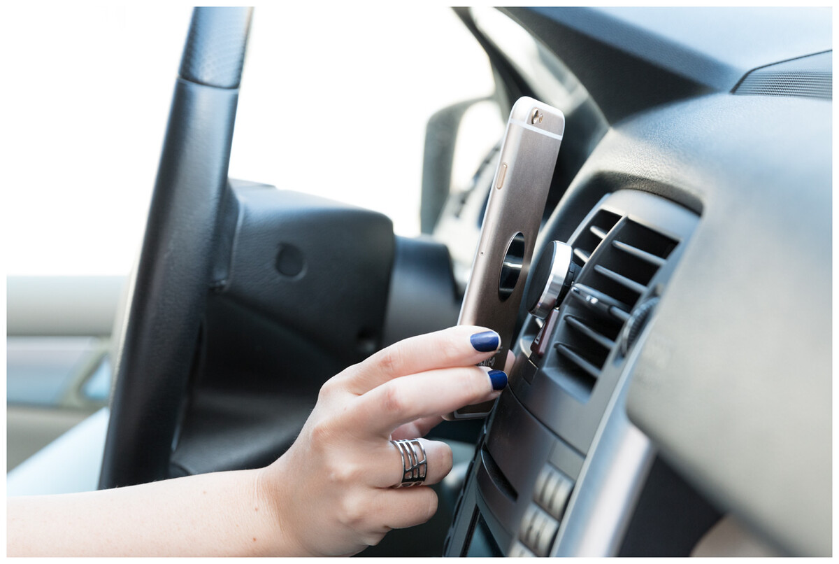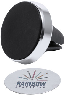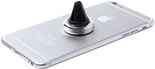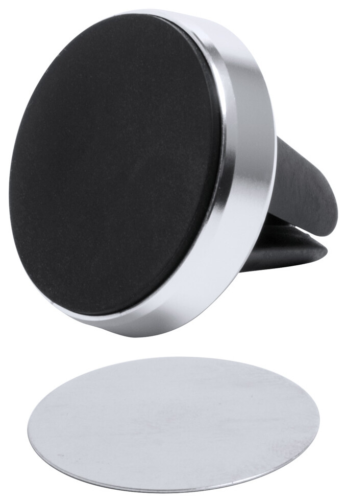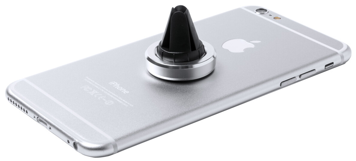 Hliníkový držák na mobil s magnetem s úchytem do větrací mřížky. Vč. samolepícího kovového plíšku, v dárkové krabičce.