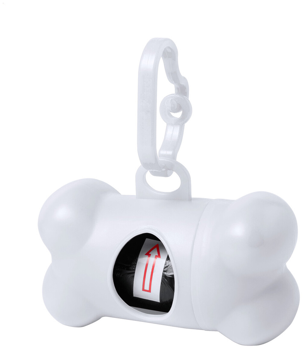 Plastový zásobník ve tvaru kosti s 15 pytlíky na psí exkrementy s karabinkou.