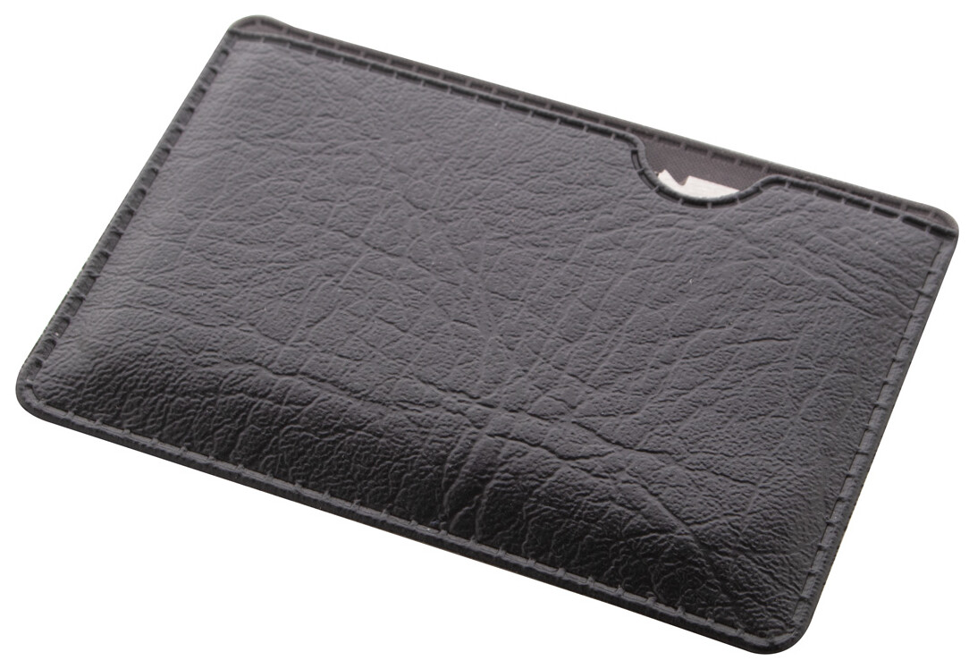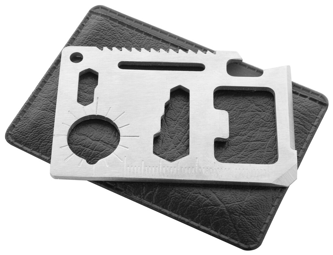 Multifunkční nářadí ve tvaru kreditní karty z nerezové oceli s 11 funkcemi v pouzdře z PU kůže.
