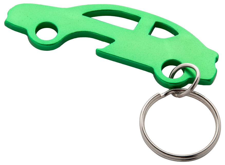 Hliníkový přívěšek na klíče ve tvaru auta s otvírákem na láhve.