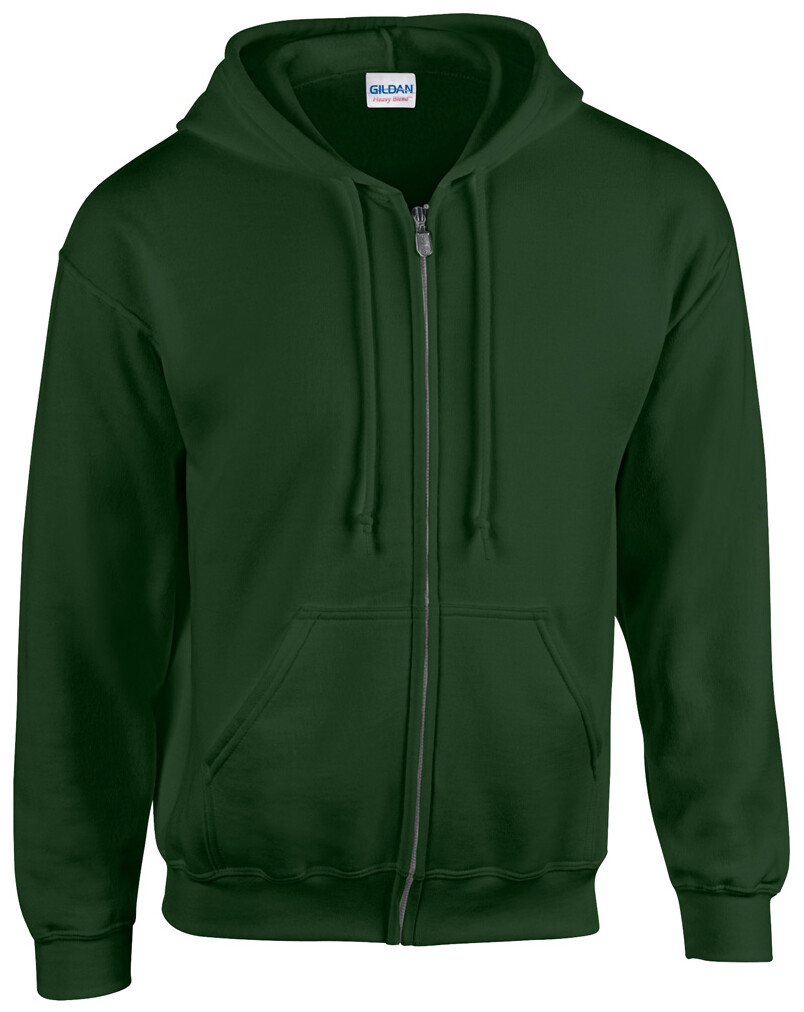 Mikina 50% bavlna / 50% polyester s kapucí, kovovým zipem a předními kapsami, 271 g/m2 (bílá 257 g/m2). Produkt značky Gildan.