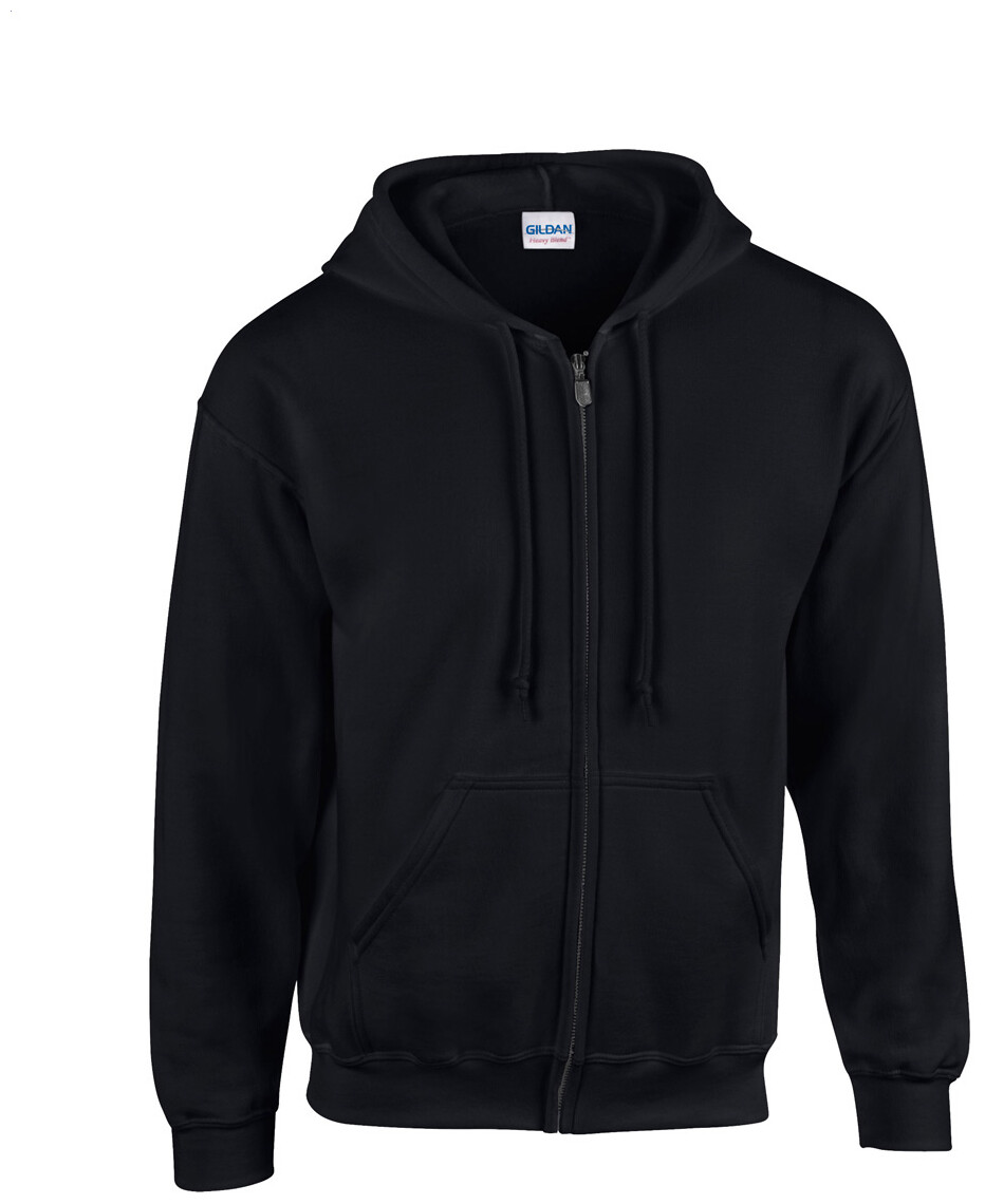 Mikina 50% bavlna / 50% polyester s kapucí, kovovým zipem a předními kapsami, 271 g/m2 (bílá 257 g/m2). Produkt značky Gildan.