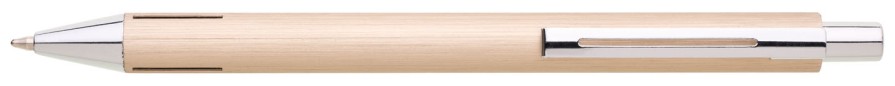 Elegantní hliníková propiska s jemně rýhovaným, zlatavým povrchem a stříbrnými doplňky.
