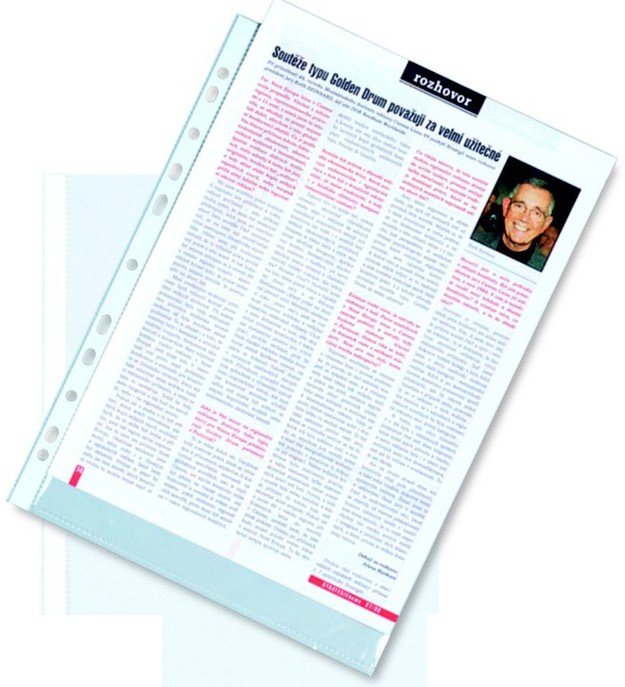 Prospektový závěsný obal, s euroděrováním na boční straně a hladkým povrchem, vhodný pro uložení dokumentů v pákových i kroužkových pořadačích. Kapsa je čiré barvy s vrchním otevíráním. Váha 50 mikronů.