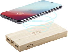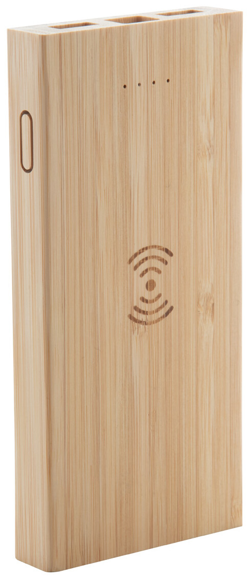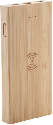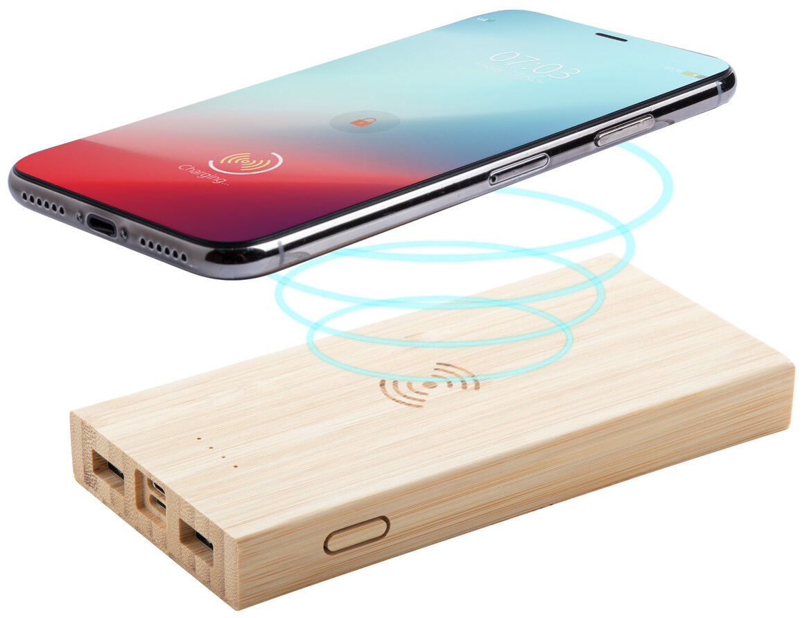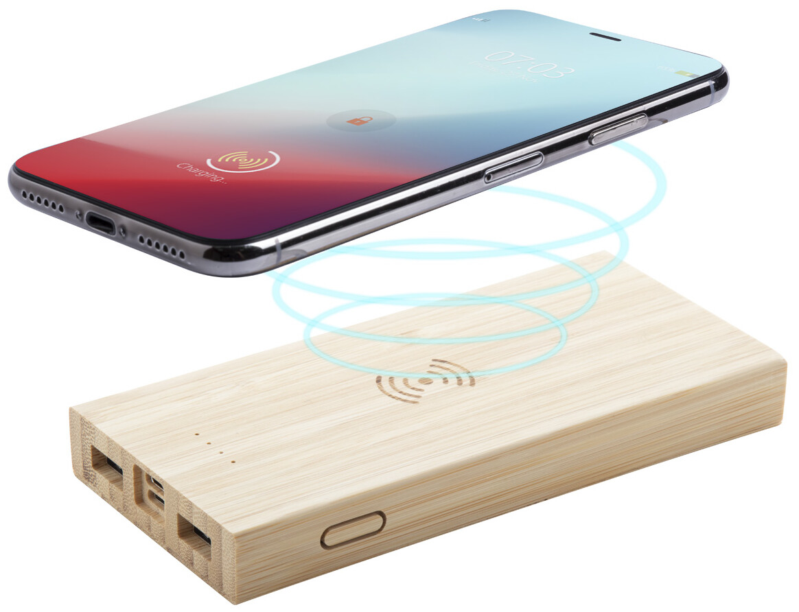 Bambusová USB power banka s vestavěnou bezdrátovou nabíječkou, 2 nabíjecími porty a 6000 mAh baterií. Power banka může být nabíjena prostřednictvím micro USB a USB-C portů. Včetně nabíjecího kabelu micro USB.