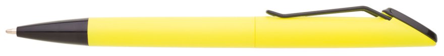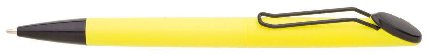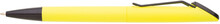 Plastová otočná propiska ARESTA v neonově žluté barvě s černou špičkou a černým kovovým klipem. Na držák klipu je možné umístit epoxy samolepku. Náplň velkoobsahová, modře píšící.