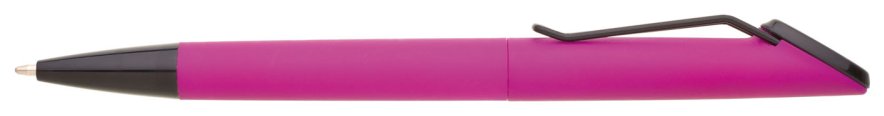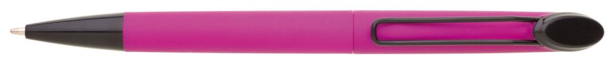 Plastová otočná propiska ARESTA v neonově fuchsiové barvě s černou špičkou a černým kovovým klipem. Na držák klipu je možné umístit epoxy samolepku. Náplň velkoobsahová, modře píšící.