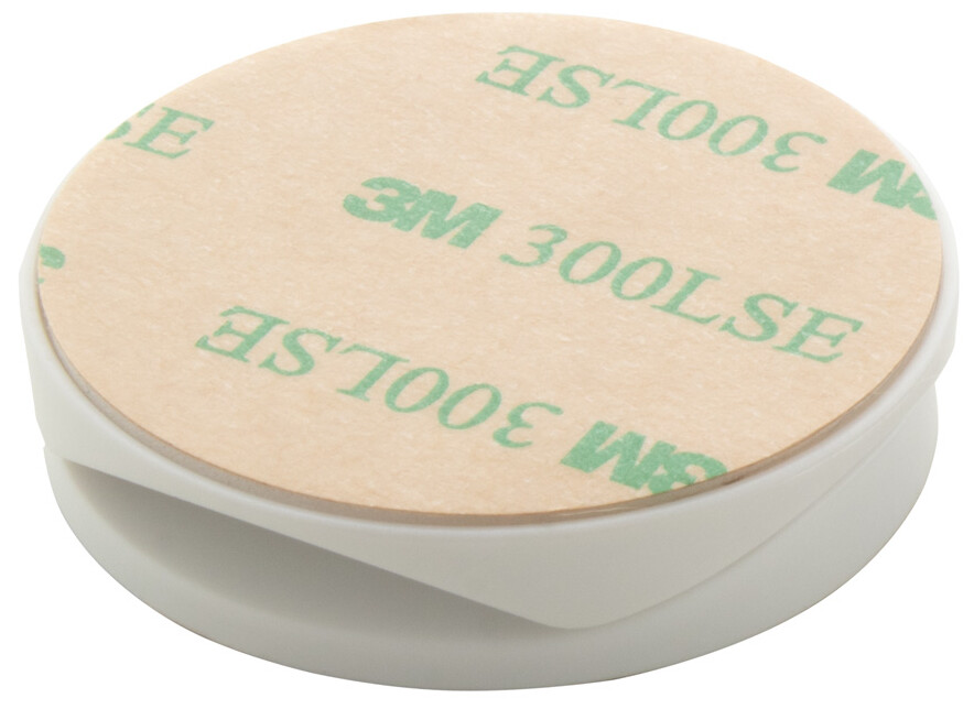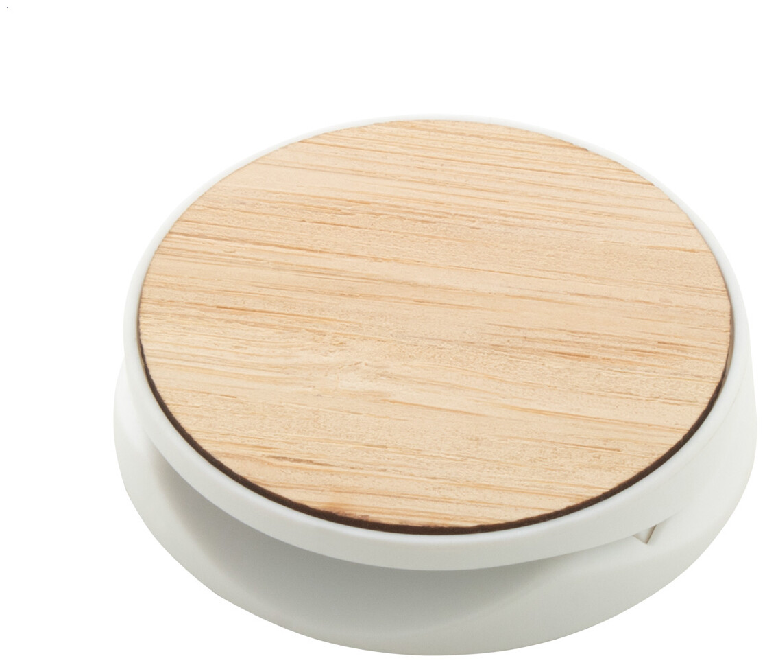 Bambusem potažený, kulatý, plastový stojánek na mobil se samolepicí základnou.