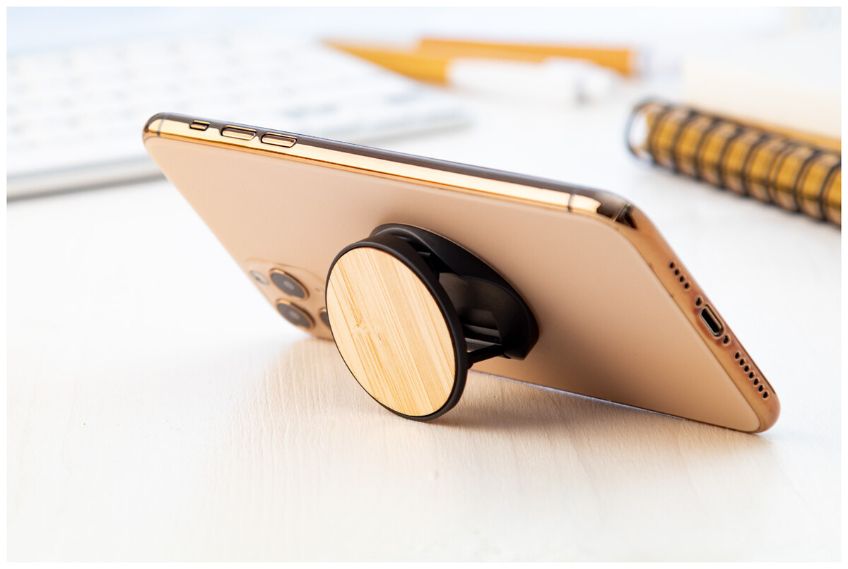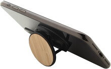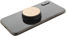 Bambusem potažený, kulatý, plastový stojánek na mobil se samolepicí základnou.