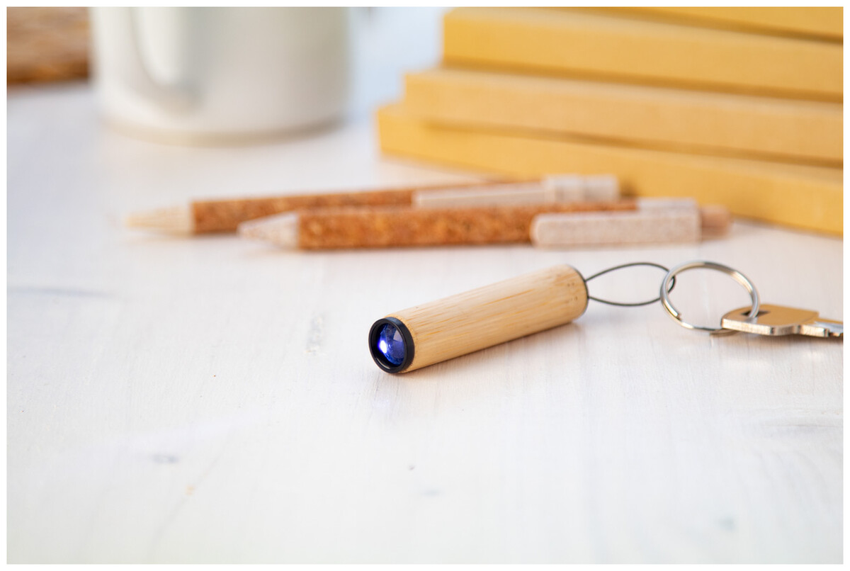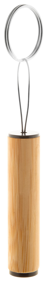 Bambusová mini baterka s 1 LED a kovovým kroužkem na klíče. S knoflíkovou baterií.