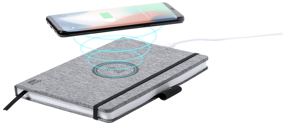 Blok A5 s deskami potaženými polyesterem RPET s vestavěnou bezdrátovou rychlonabíječkou (10W) a 80 linkovanými listy. Včetně USB nabíjecího kabelu. Polyester 300D RPET.