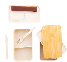 Box na jídlo z PP plastu se sadou příborů (vidlička, lžíce a nůž), bambusovým víkem a elastickým popruhem. Se 2 přihrádkami o objemu 700 ml.