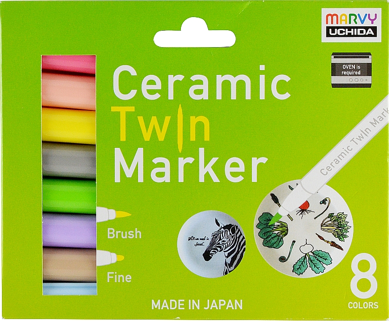 Sada popisovačů na keramiku, sklo a porcelán v sadě. Dva různé hroty pro aplikaci zapékacího inkoustu. Široký výběr barev.