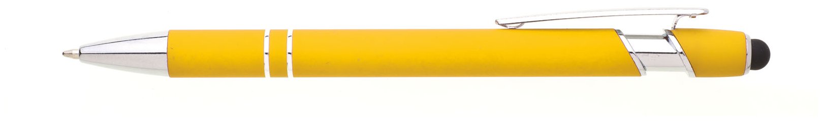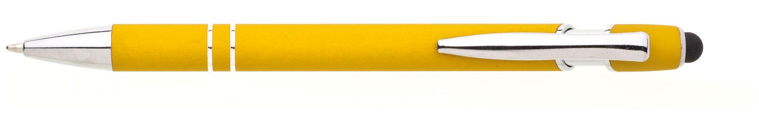 Propiska s touch koncem, měkkým pogumovaným soft povrchem ve žluté barvě a stříbrnými doplňky včetně dvou ozdobných kroužků. (NATIO)