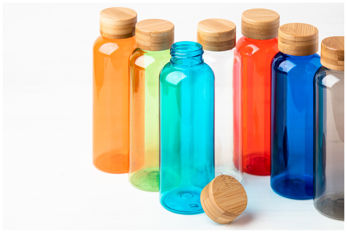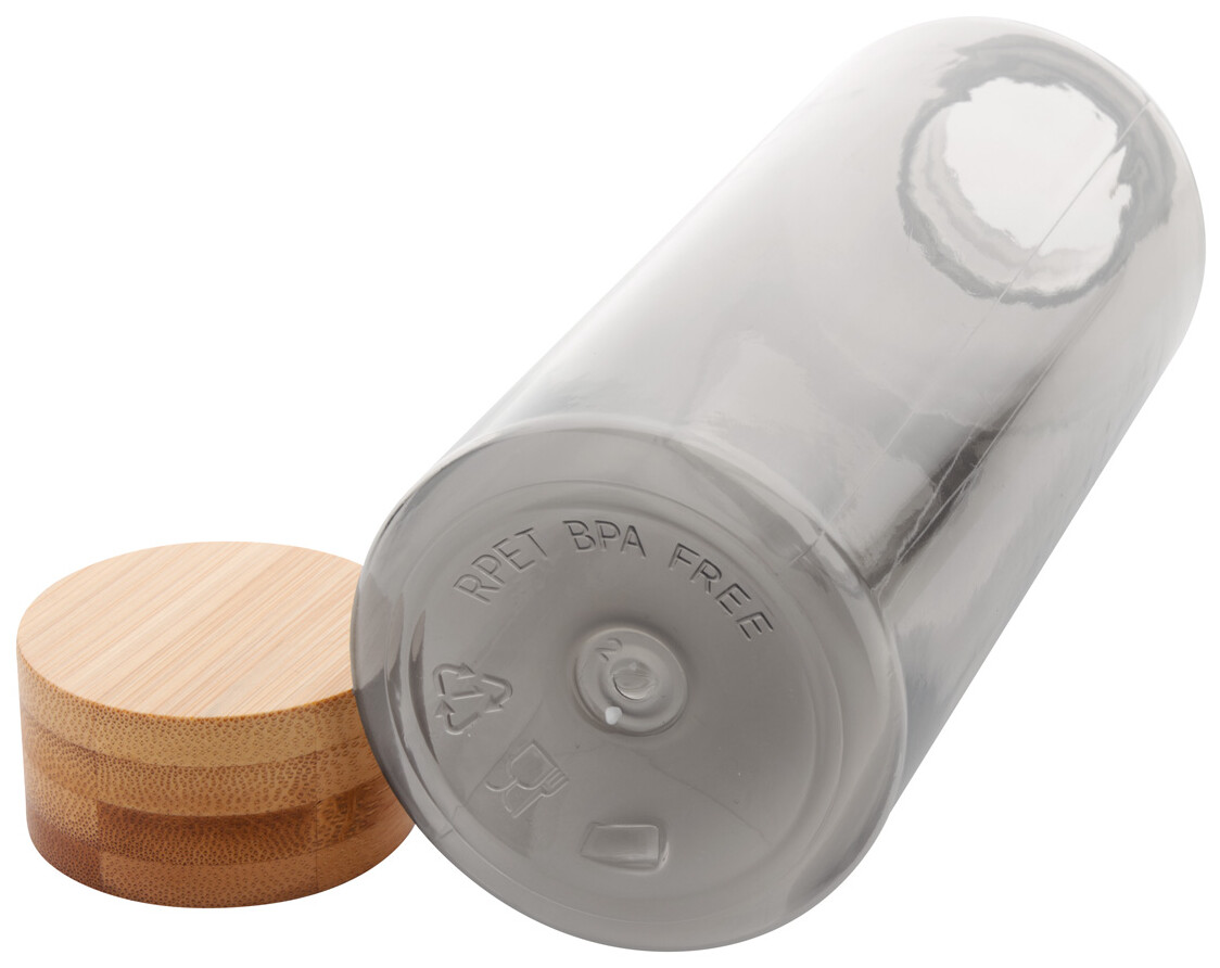 Láhev RPET s bambusovým víčkem, 500 ml. Bez BPA. Nevhodné pro sycené nápoje.