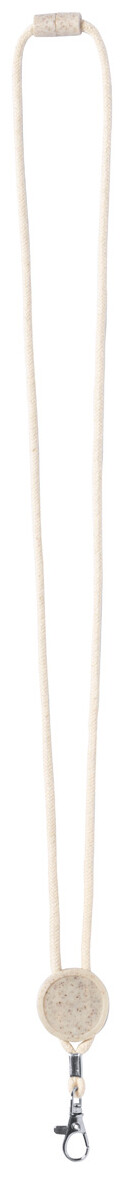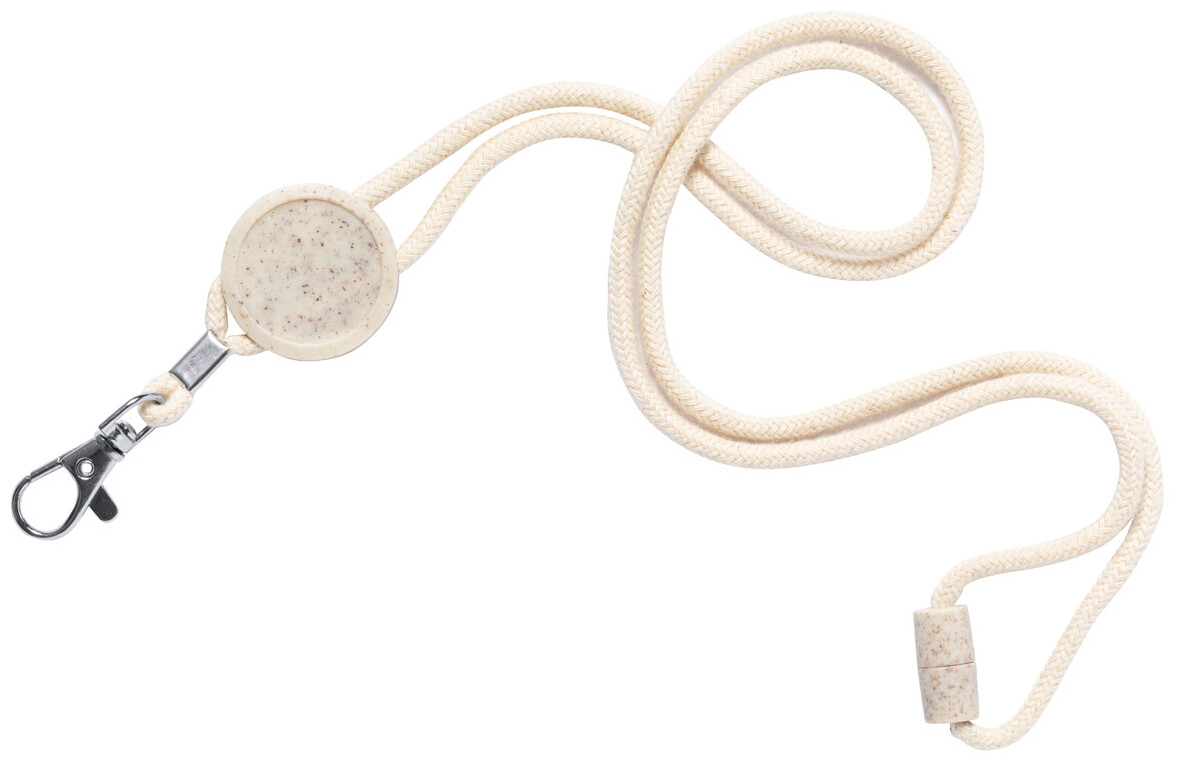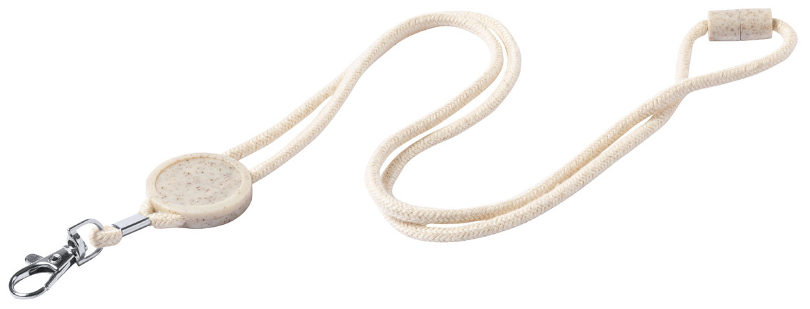 Bavlněný lanyard na krk s kovovou karabinou, bezpečnostní přezkou a kulatým štítkem z ekologické pšeničné slámy a ABS plastu. Ideální pro epoxy potisk.