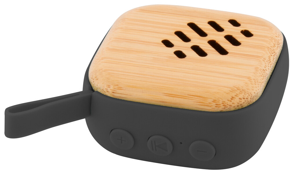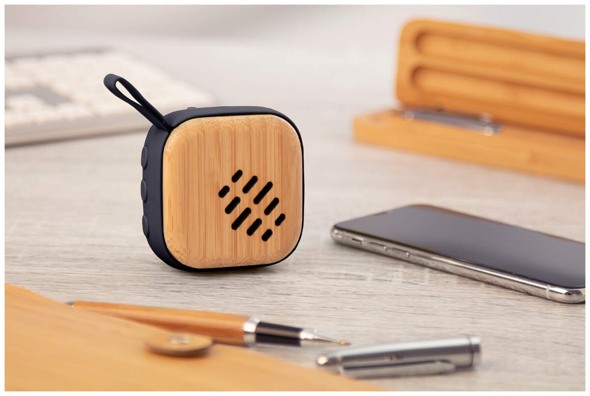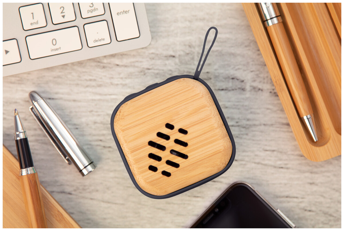 Bezdrátový reproduktor v pouzdře z bambusu a ABS plastu s funkcí hands-free volání a vestavěnou dobíjecí baterií. Včetně nabíjecího kabelu USB.