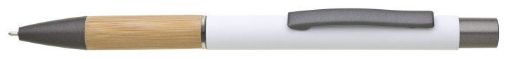 Kovová propiska s hnědo-černými doplňky, pogumovaným povrchem a bambusovým úchopem. Náplň semigelová s mikrohrotem.