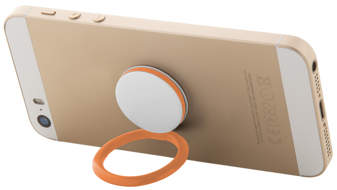 Kulatý, plastový stojánek na mobil s kroužkem na prst se samolepícím stranou.