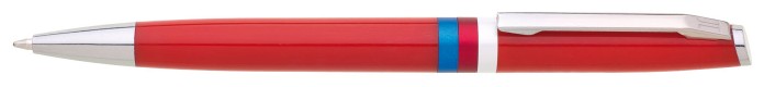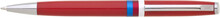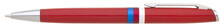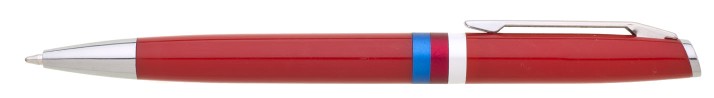 Červená otočná propiska s trikolórou. Náplň velkoobsahová, modře píšící.