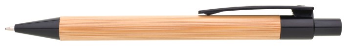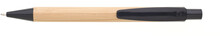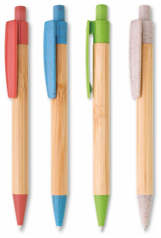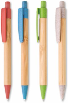 Bambusové tělo propisky s doplňky z plastu s podílem slámy. Náplň modře píšící velkoobsahová.