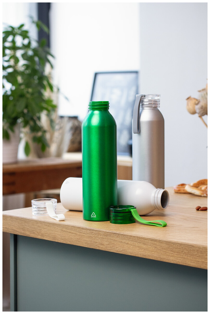 Láhev z recyklovaného hliníku s víčkem v odpovídající barvě a silikonovým popruhem, 600 ml.