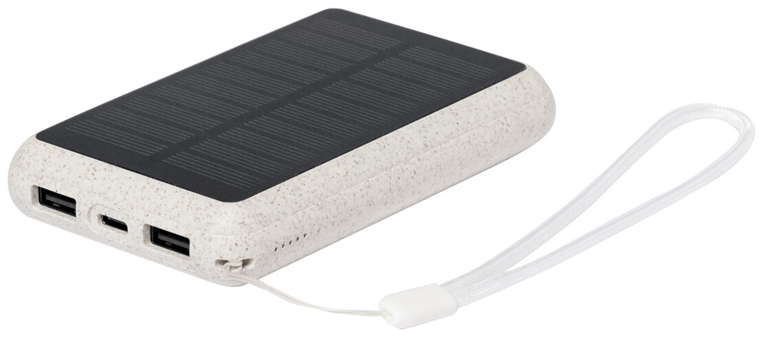 USB power banka v ekologickém plastovém pouzdře z pšeničné slámy se zabudovanou solární nabíječkou a 5000 mAh baterií. Se 2 porty USB a 1 portem USB-C pro nabíječku. Vstupní port USB-C.