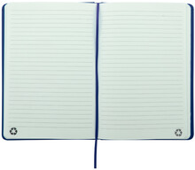 Blok potažený recyklovanou PU kůží se 100 linkovanými listy z recyklovaného papíru. Se záložkou v odpovídající barvě a gumičkou. Velikost A5.