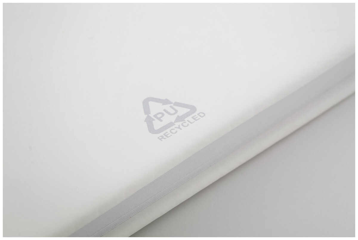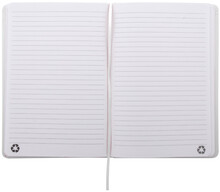 Blok potažený recyklovanou PU kůží se 100 linkovanými listy z recyklovaného papíru. Se záložkou v odpovídající barvě a gumičkou. Velikost A5.