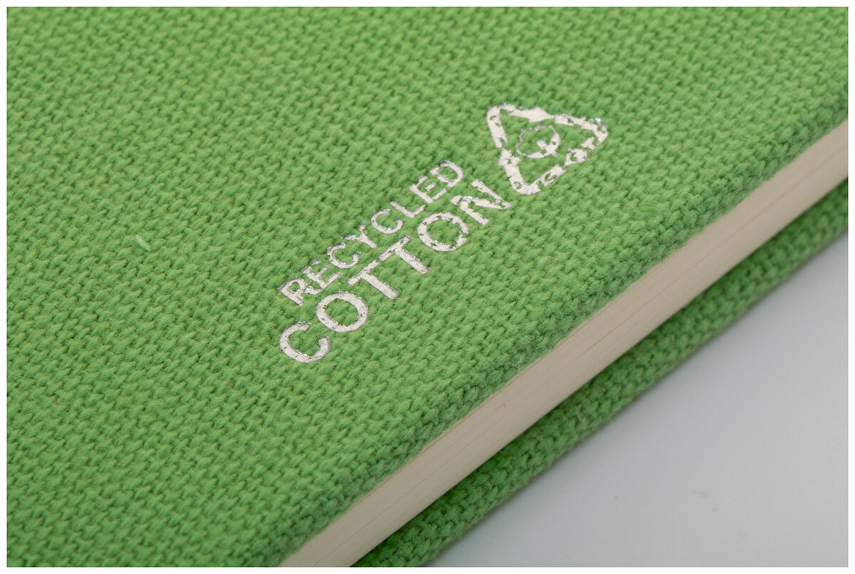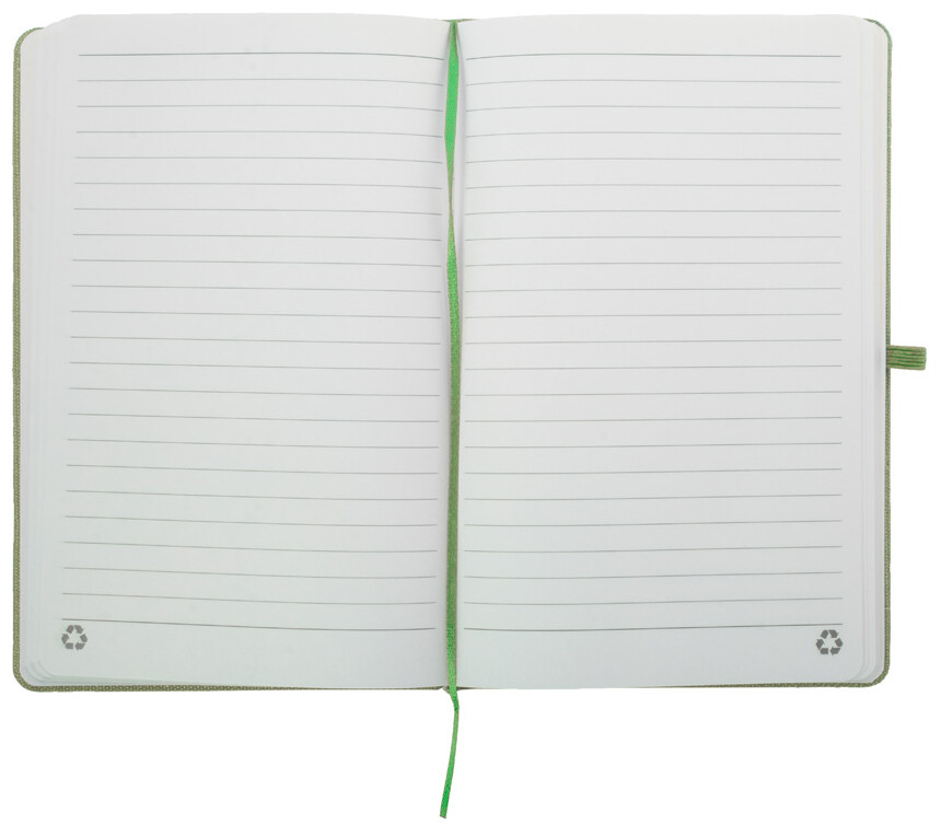 Blok potažený recyklovanou bavlnou s 80 linkovanými listy z recyklovaného papíru. Se záložkou v odpovídající barvě, gumičkou a držákem na pero. Velikost A5.