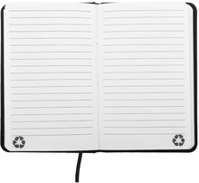 Blok potažený recyklovanou PU kůží se 100 linkovanými listy z recyklovaného papíru. Se záložkou v odpovídající barvě a gumičkou. Velikost A6.