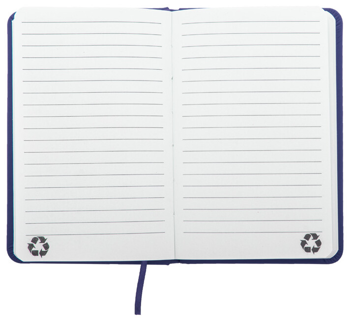 Blok potažený recyklovanou PU kůží se 100 linkovanými listy z recyklovaného papíru. Se záložkou v odpovídající barvě a gumičkou. Velikost A6.