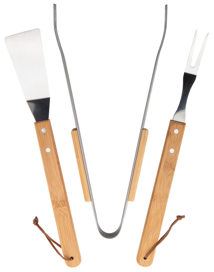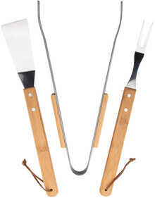3dílná grilovací sada z nerezové oceli s bambusovou rukojetí (vidlička, kleště a lopatka) v kraftové papírové krabičce.