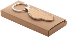 Kovový přívěsek na klíče ve tvaru auta s bambusovou vložkou. V kraftové papírové krabici.