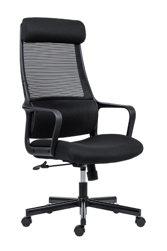 Kancelářská židle s vysokým prodyšným opěrákem, opěrkou hlavy, houpací mechanismus s nastavením síly protiváhy, bederní opěrka a ocelová lakovaná báze.