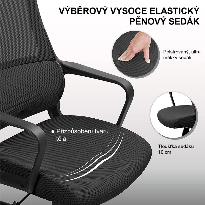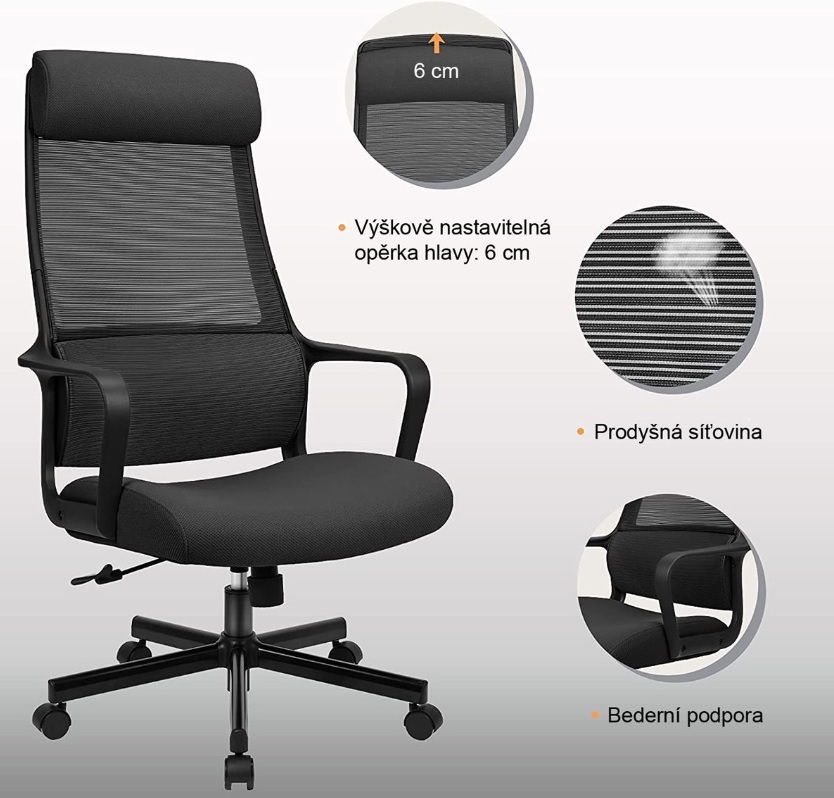 • prodyšná síťovaná židle s měkkým čalounem a polstrovanou opěrkou hlavy