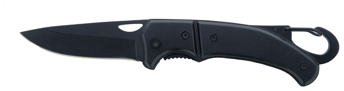 Kapesní nůž z nerezové oceli s hliníkovou rukojetí, karabinou a bezpečnostní pojistkou.