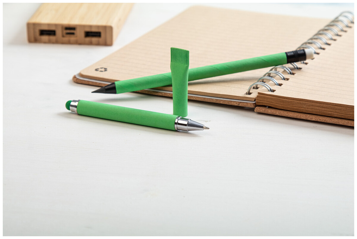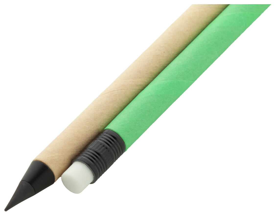 Bez inkoustové pero s dlouhou životností z recyklovaného papíru s černými detaily a gumou. S hrotem z kovové slitiny, který oxiduje papír. Toto pero píše podobně jako tužka a navíc je stíratelné.