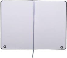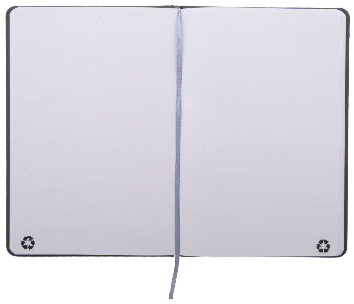 Blok A5 z recyklované PU kůže se 100 čistými listy z recyklovaného papíru. Se záložkou v odpovídající barvě a gumičkou.