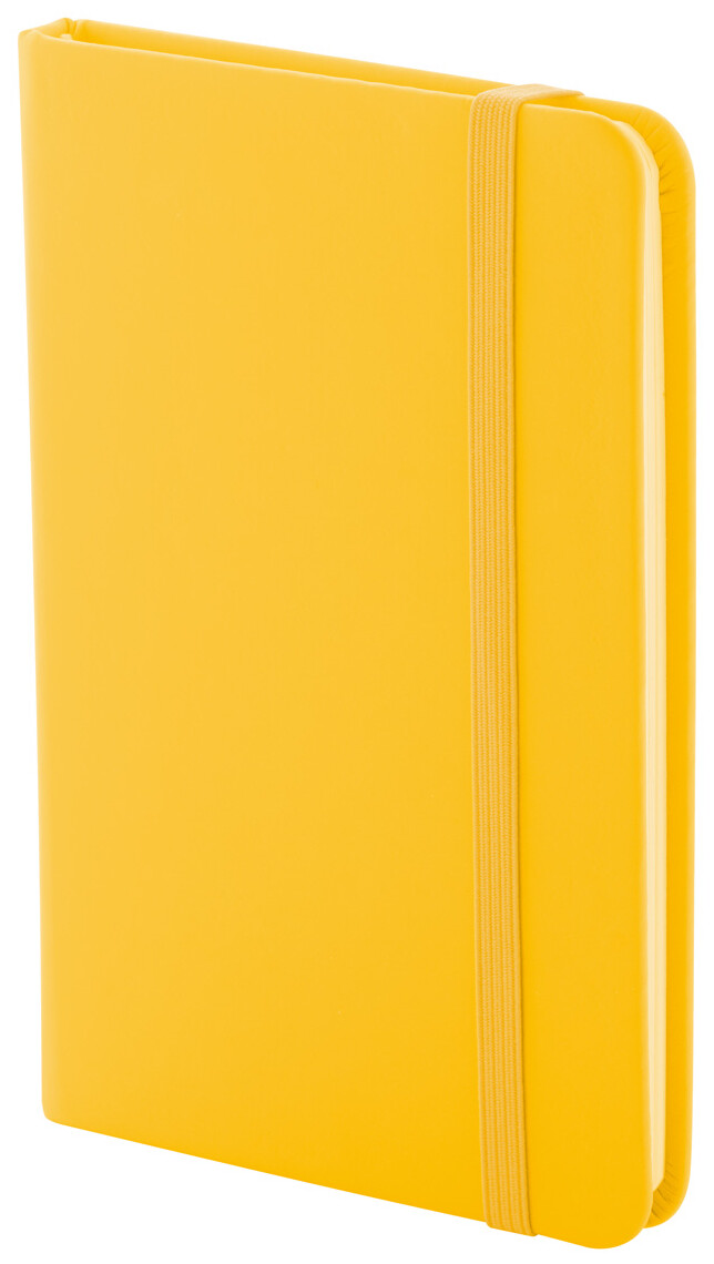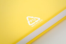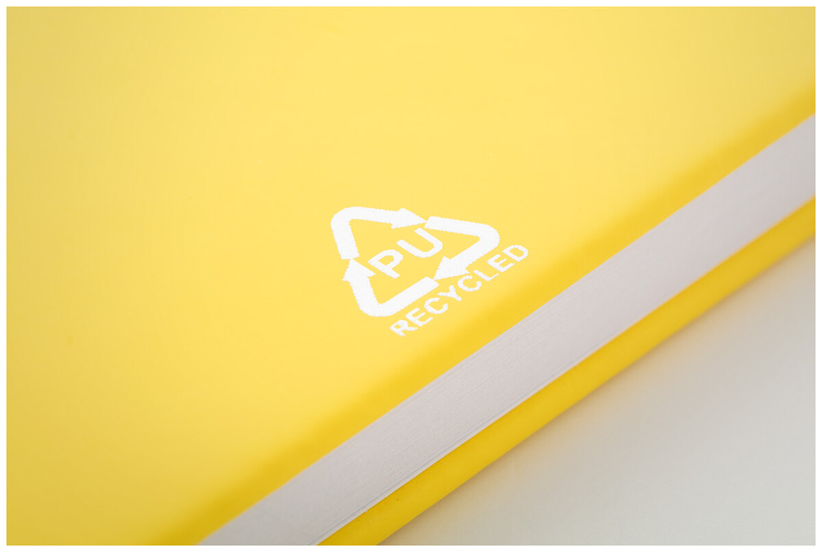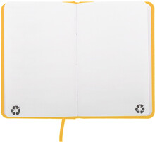 Blok A6 z recyklované PU kůže se 100 čistými listy z recyklovaného papíru. Se záložkou v odpovídající barvě a gumičkou.
