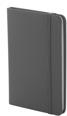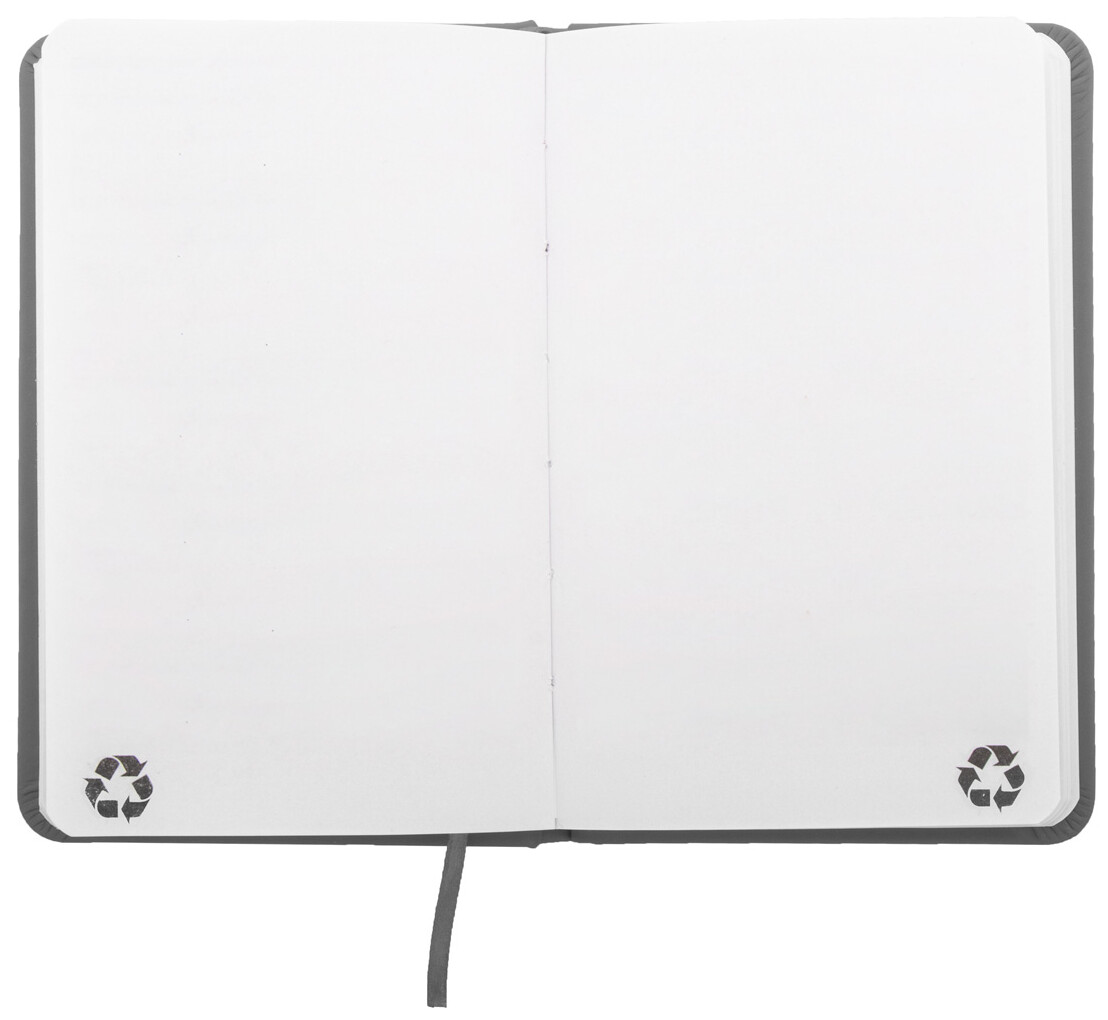 Blok A6 z recyklované PU kůže se 100 čistými listy z recyklovaného papíru. Se záložkou v odpovídající barvě a gumičkou.