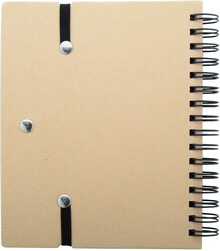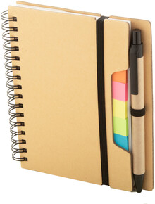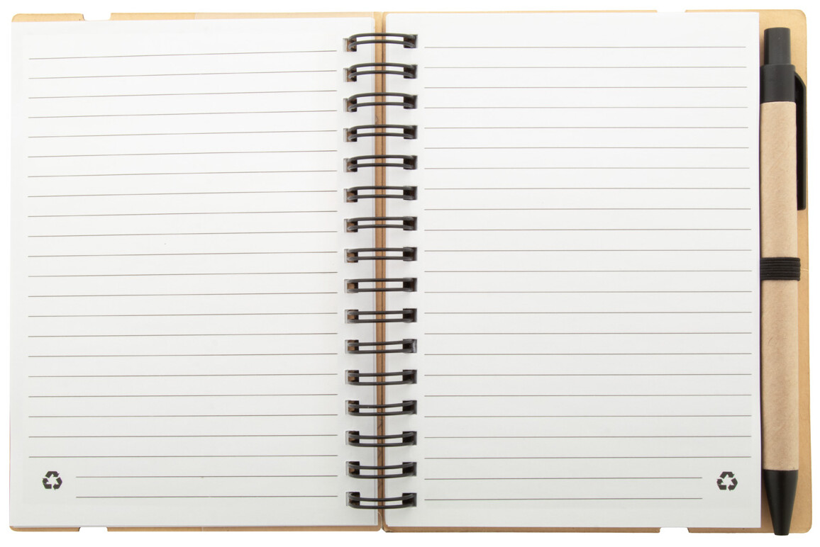 Spirálový blok A6 z recyklovaného papíru se 70 linkovanými listy a 125 popisovači stránek (v 5 různých barvách). S gumovým páskem a držákem na pero. Včetně kuličkového pera z recyklovaného papíru s modrou náplní.
