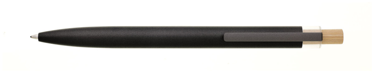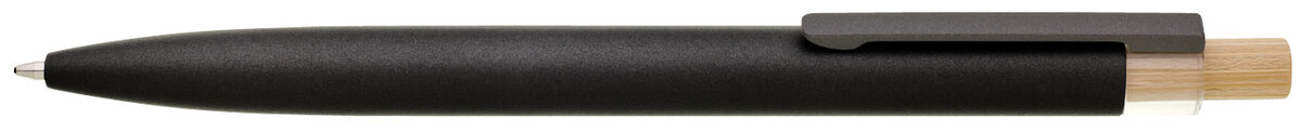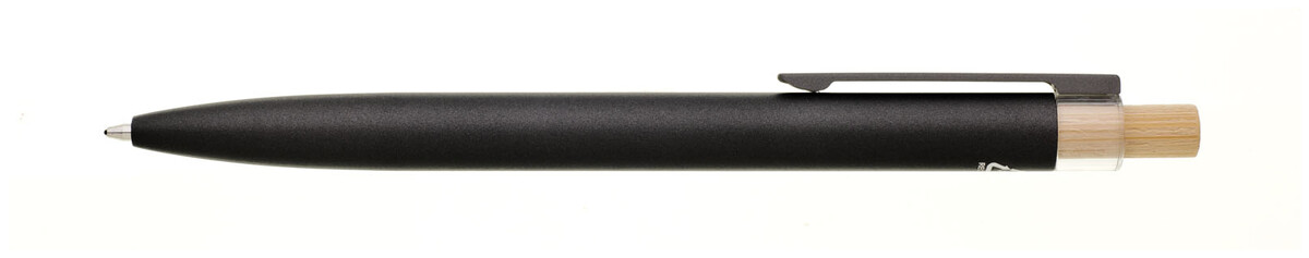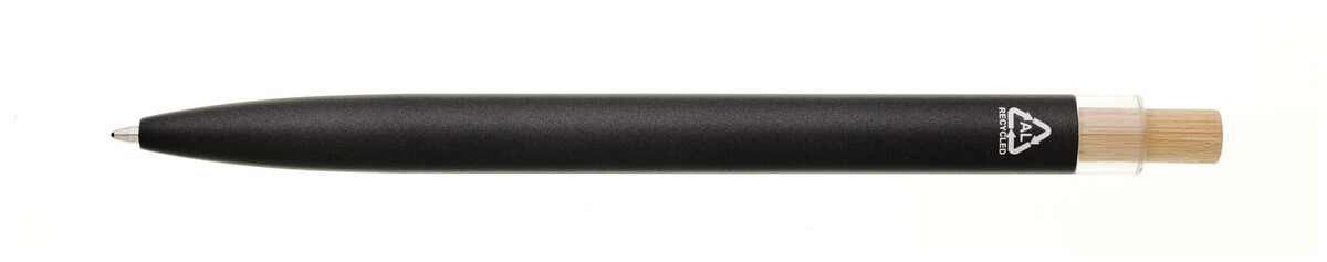 Černá designová kovová propiska z recyklovaného hliníku. Tmavý kovový klip je uchycen v ozdobné transparentní koncovce, doplněné bambusovým cvakátkem. Náplň velkoobsahová, modře píšící. Kolekce SAVE THE NATURE.