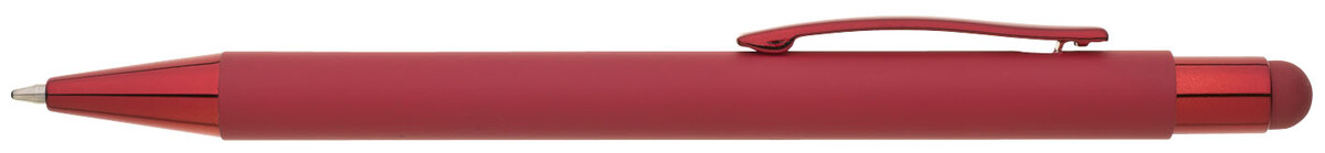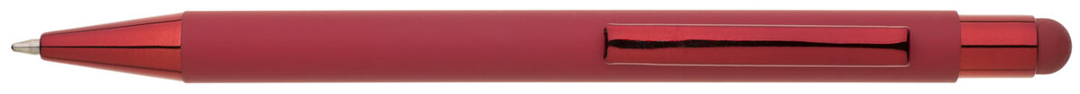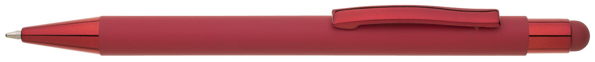 Červené pogumované matné tělo propisky doplňují lesklé doplňky v barvě těla a matný touch konec. Logo po vylaserování je lesklé stříbrné. Velkoobsahová modře píšící náplň.